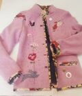 Lambavillasest lõngast kootud jakk on seljas kerge, mugav ja soe. Jakil on käsitsi tikitud Muhu vanas lankimistehnikas muster stiliseeritud loomade ja lilledega, muster on kaetud swarovski kristallidega.