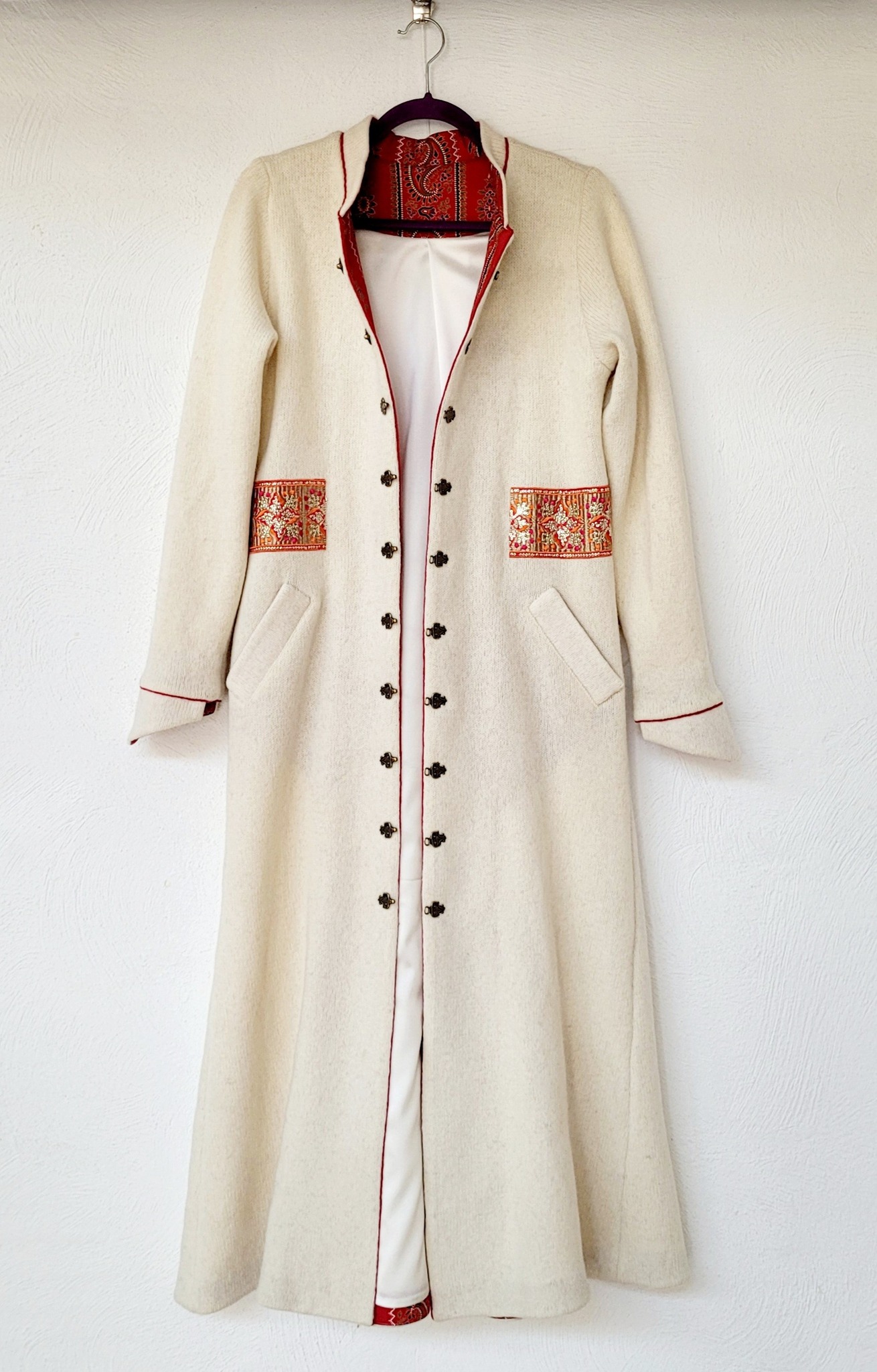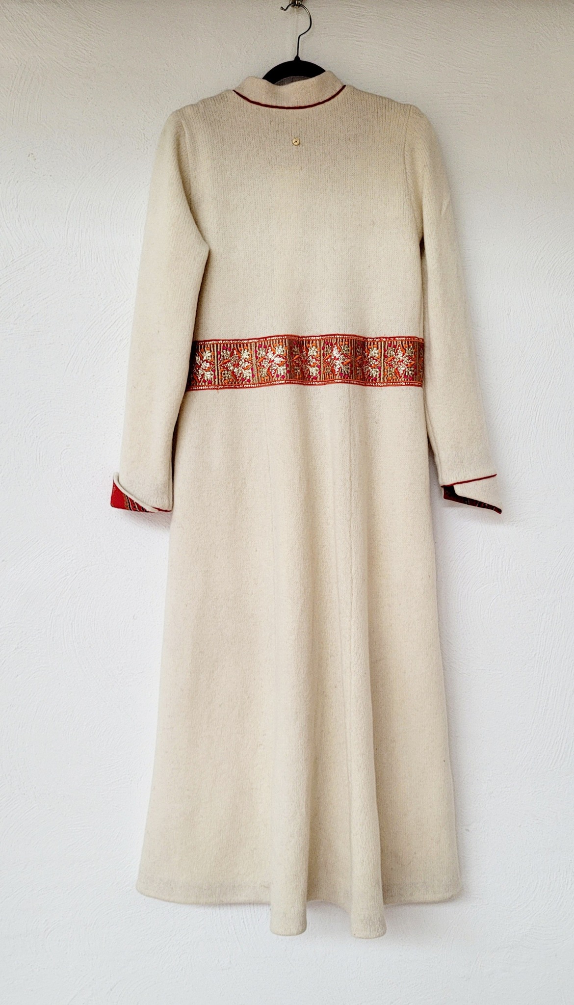 Lambavillasest lõngast kootud mantel on valmistatud etnograafiliste kasukate ainetel ning sellel on varrukatel käsulapid. Punane kaaruspael kaunistab nii hõlmu, kui varrukaid. Seljas on mantel kerge, mugav ja soe, püsib hästi vormis ning jälgib kandja figuuri. Haakidega mantlil on püstkrae ning sissetöödeldud taskud. Mantlil on siidvooder ja puuvillased katteriided.